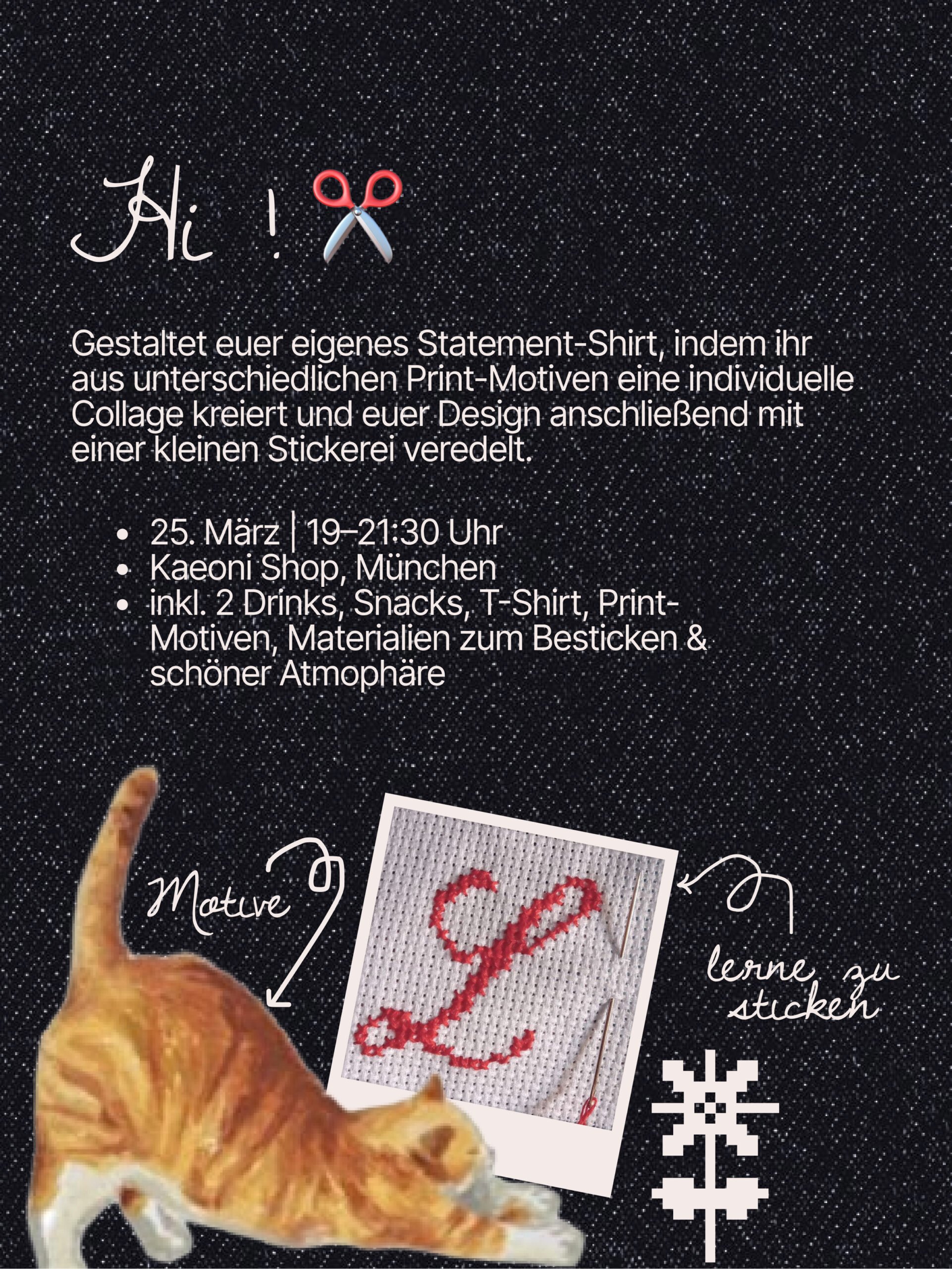 An diesem Mittwoch mixen wir euch nicht nur zwei leckere Drinks, sondern bringen auch alles mit, was ihr braucht, um euer eigenes Statement-Shirt zu gestalten. Erst erstellt ihr aus unseren Print-Motiven eure ganz persönliche Collage auf einem T-Shirt. Von Kirschen & Blumen über Tiere & Schleifen bis zu Retro-Motiven und Buchstaben. Mix & Match eure Favorites. 💌🍒🪩 Danach veredelt ihr euer Design mit einer kleinen, individuellen Stickerei, wie z.B. einem Buchstaben oder Herz.
