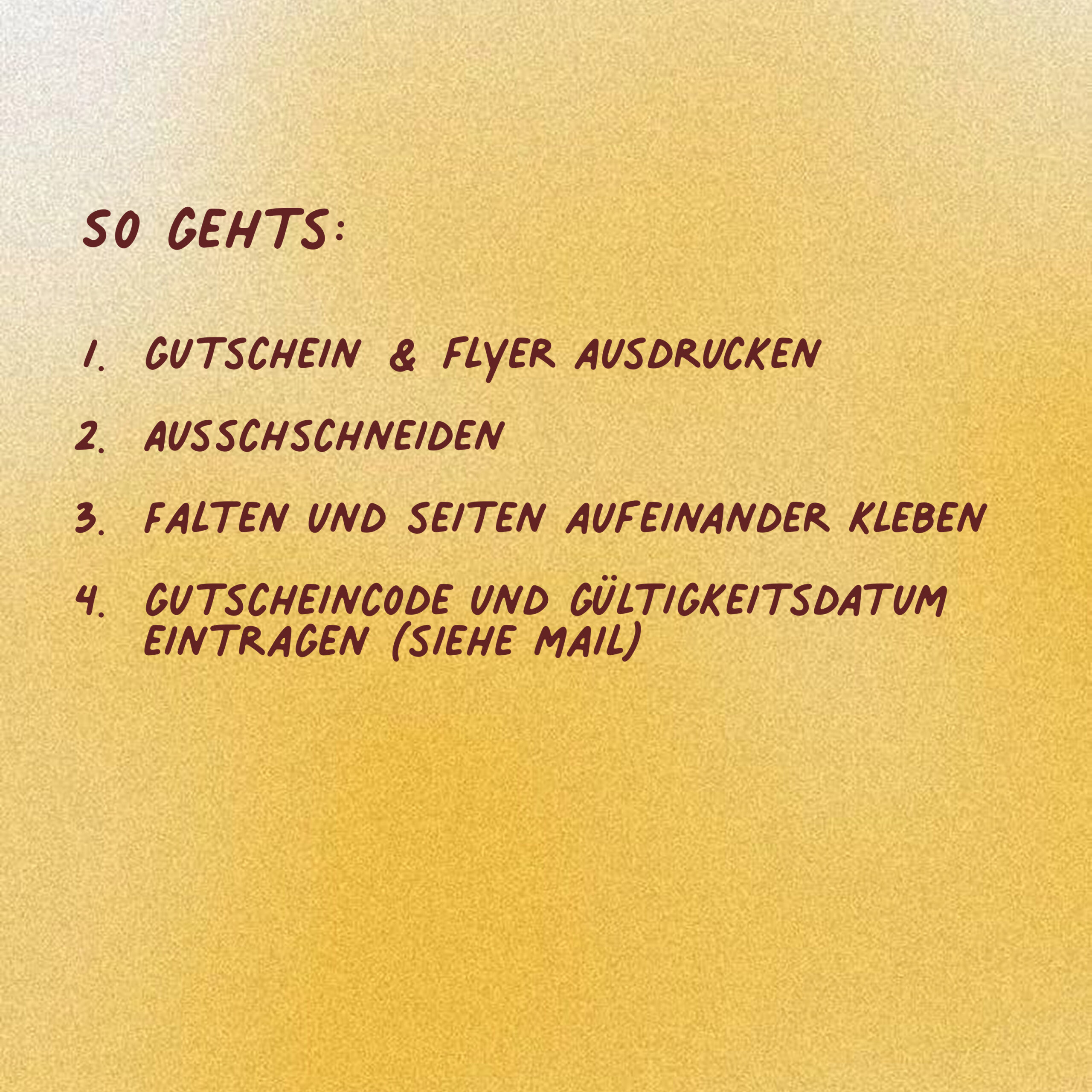 Nach dem Kauf erhältst du den Gutschein direkt als Download zum Ausdrucken und selbst beschriften. Den persönlichen Gutscheincode schicken wir dir innerhalb weniger Stunden nach deiner Bestellung zu.