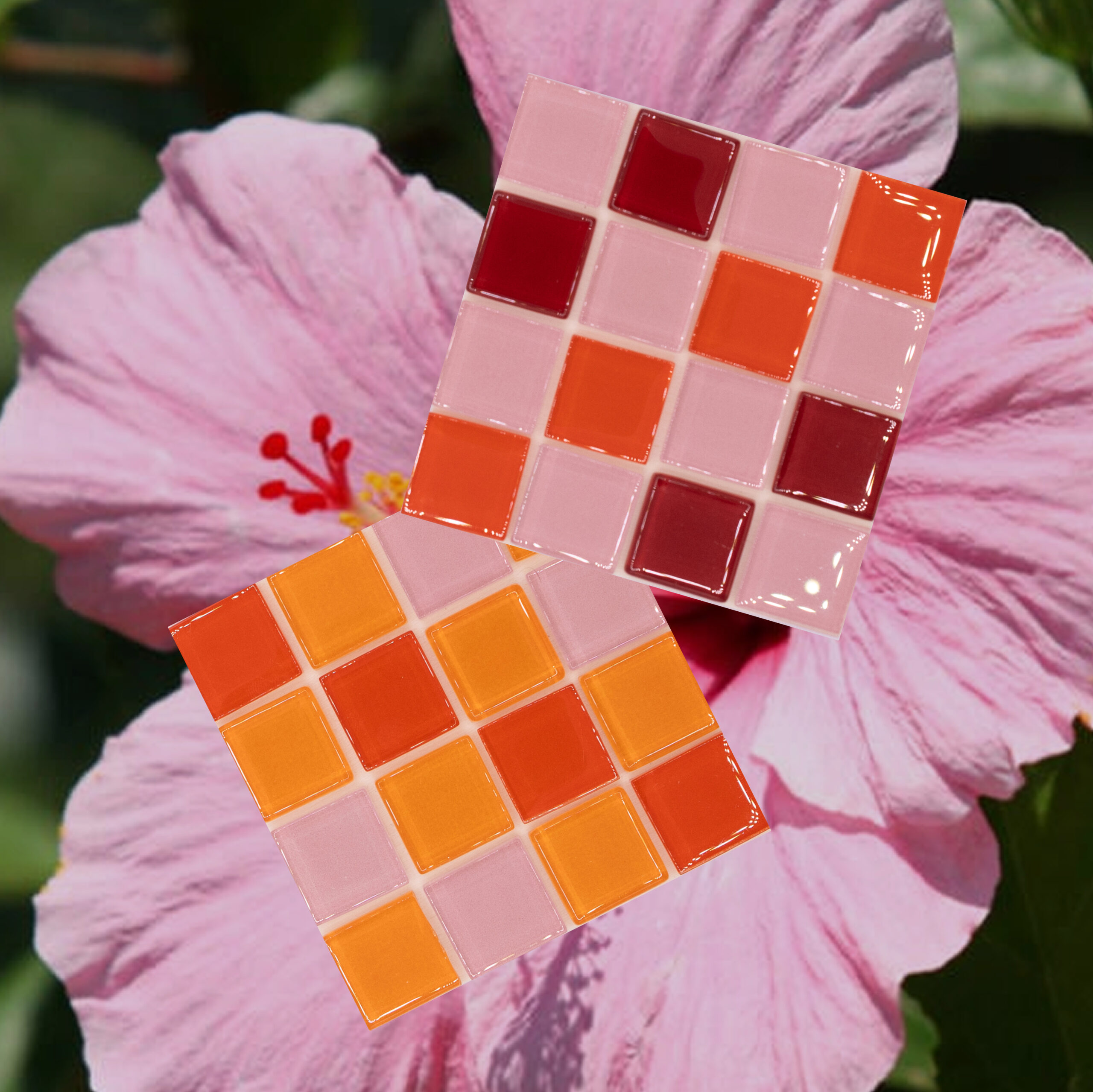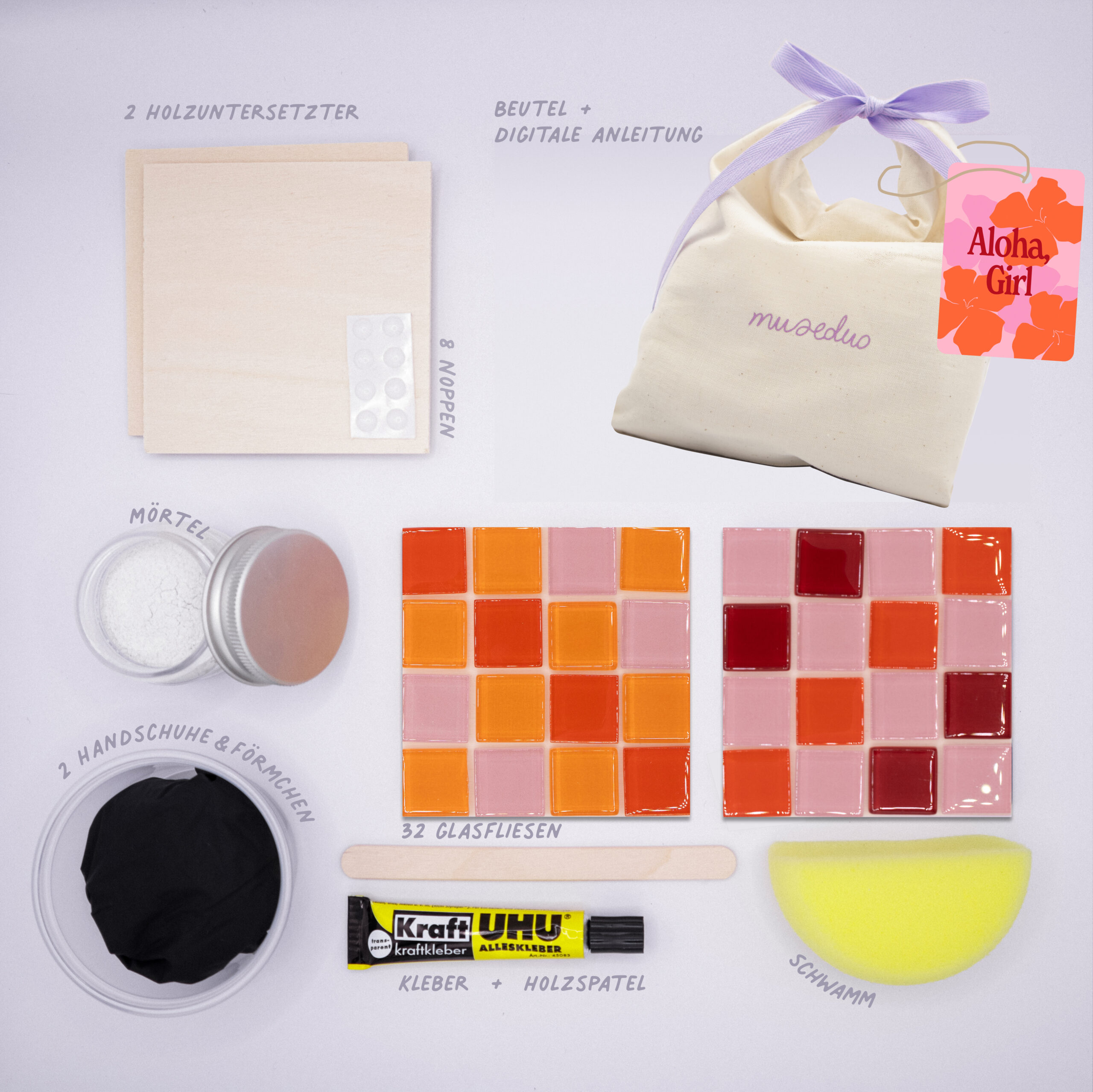 Gestaltet pro Set zwei Glasfliesen-Untersetzer – mit digitaler Anleitung, Musik-Playlist und Fragen, die verbinden.