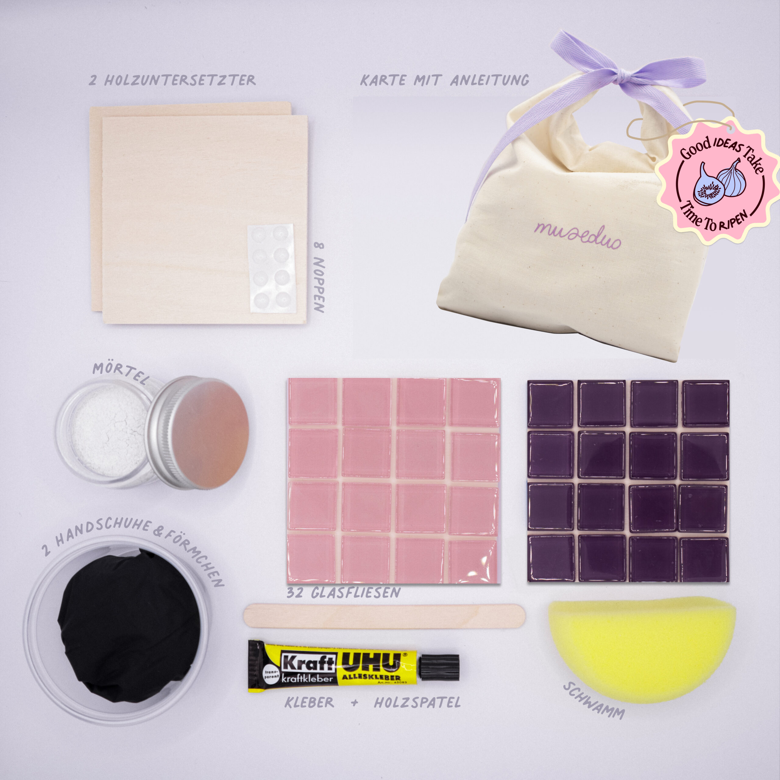 Gestaltet pro Set zwei Glasfliesen-Untersetzer – mit digitaler Anleitung, Musik-Playlist und Fragen, die verbinden.