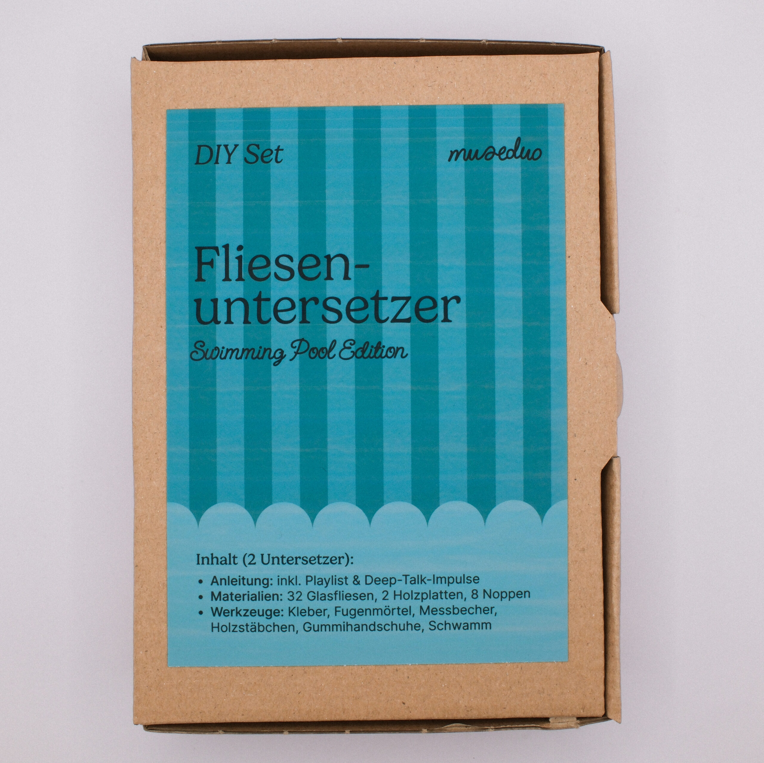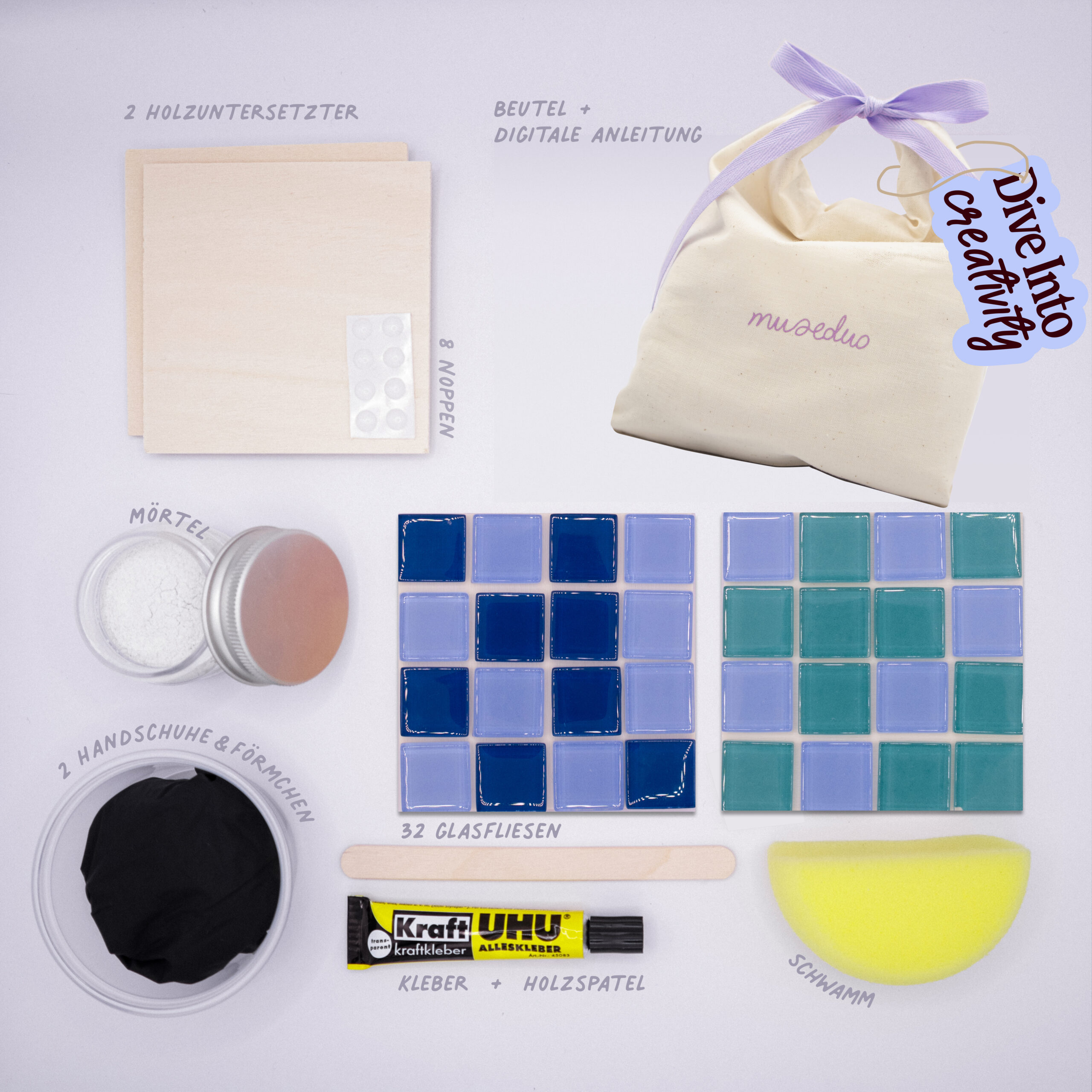 Gestaltet pro Set zwei Glasfliesen-Untersetzer – mit digitaler Anleitung, Musik-Playlist und Fragen, die verbinden.