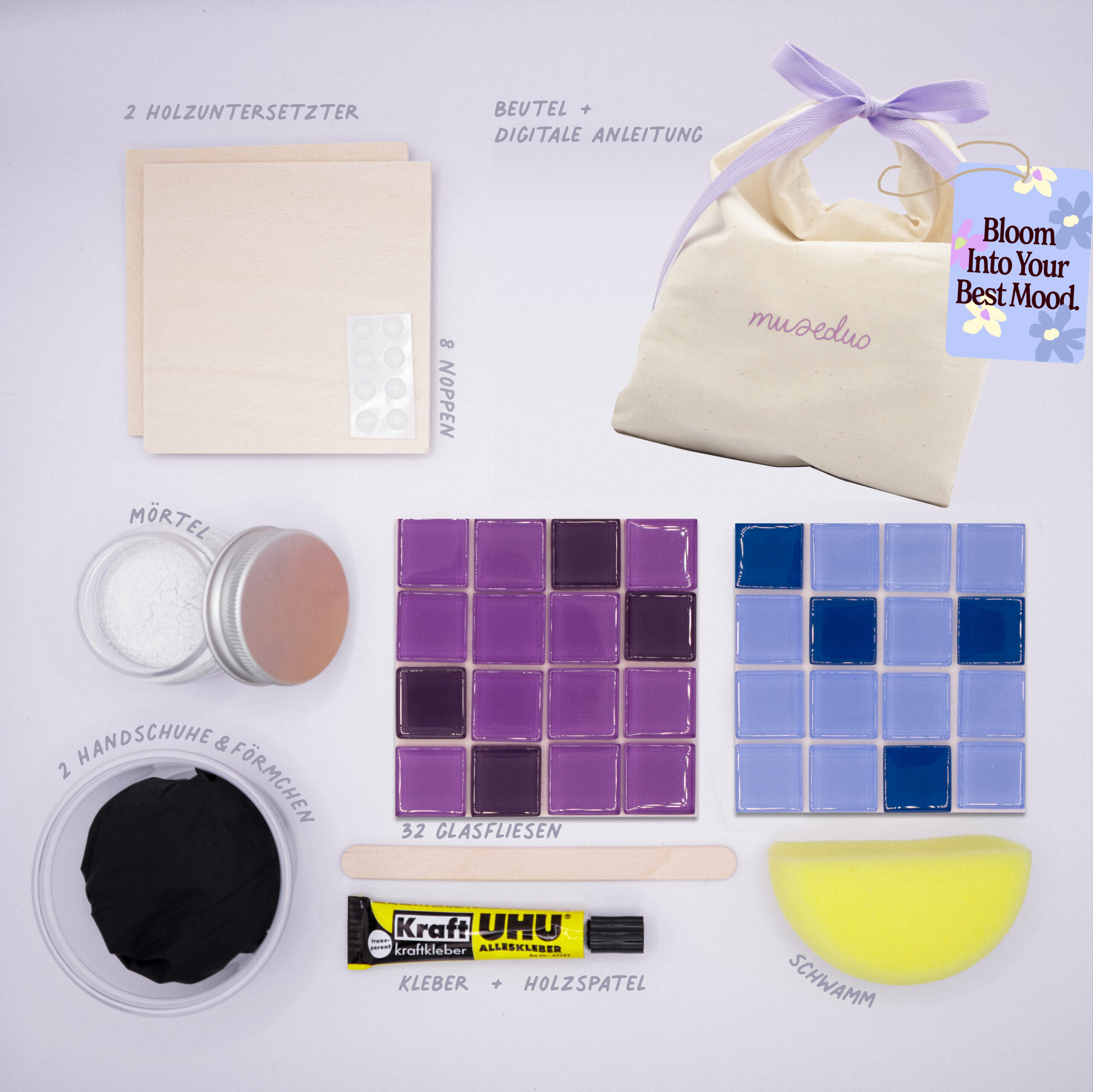 Gestaltet pro Set zwei Glasfliesen-Untersetzer – mit digitaler Anleitung, Musik-Playlist und Fragen, die verbinden.