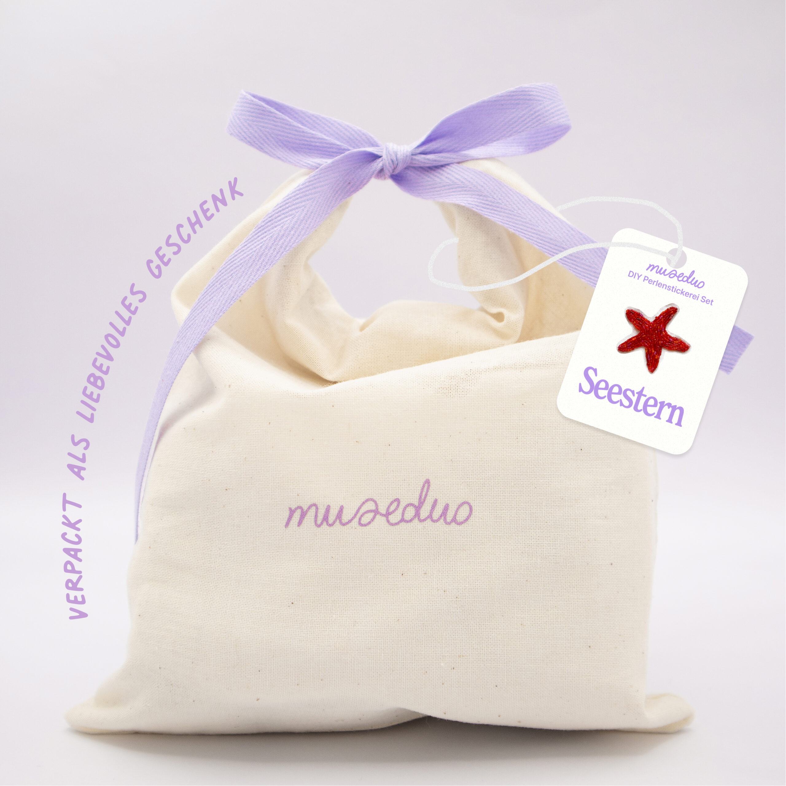 Das perfekte Geschenk für kreative Me-Time oder gemeinsame Stunden: Bestickt euer eigenes Piece mit Glasperlen, inklusive Anleitung, Musik-Playlist & Deep-Talk-Fragen. Alles verpackt in einem süßen Baumwollbeutel!