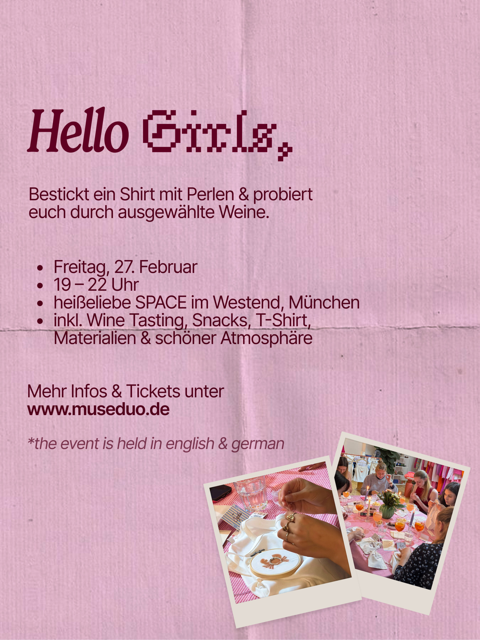 Entdecke mehr auf Instagram: @muse.duoAm Freitagabend wird’s bei uns kreativ, cozy & auch ein bisschen fancy. Gemeinsam besticken wir ein Shirt mit Perlen. Du kannst aus verschiedenen Motiven wählen und dein Piece ganz nach deinem Stil gestalten. Keine Sorge: Wir erklären dir alles Schritt für Schritt, Vorkenntnisse brauchst du nicht.